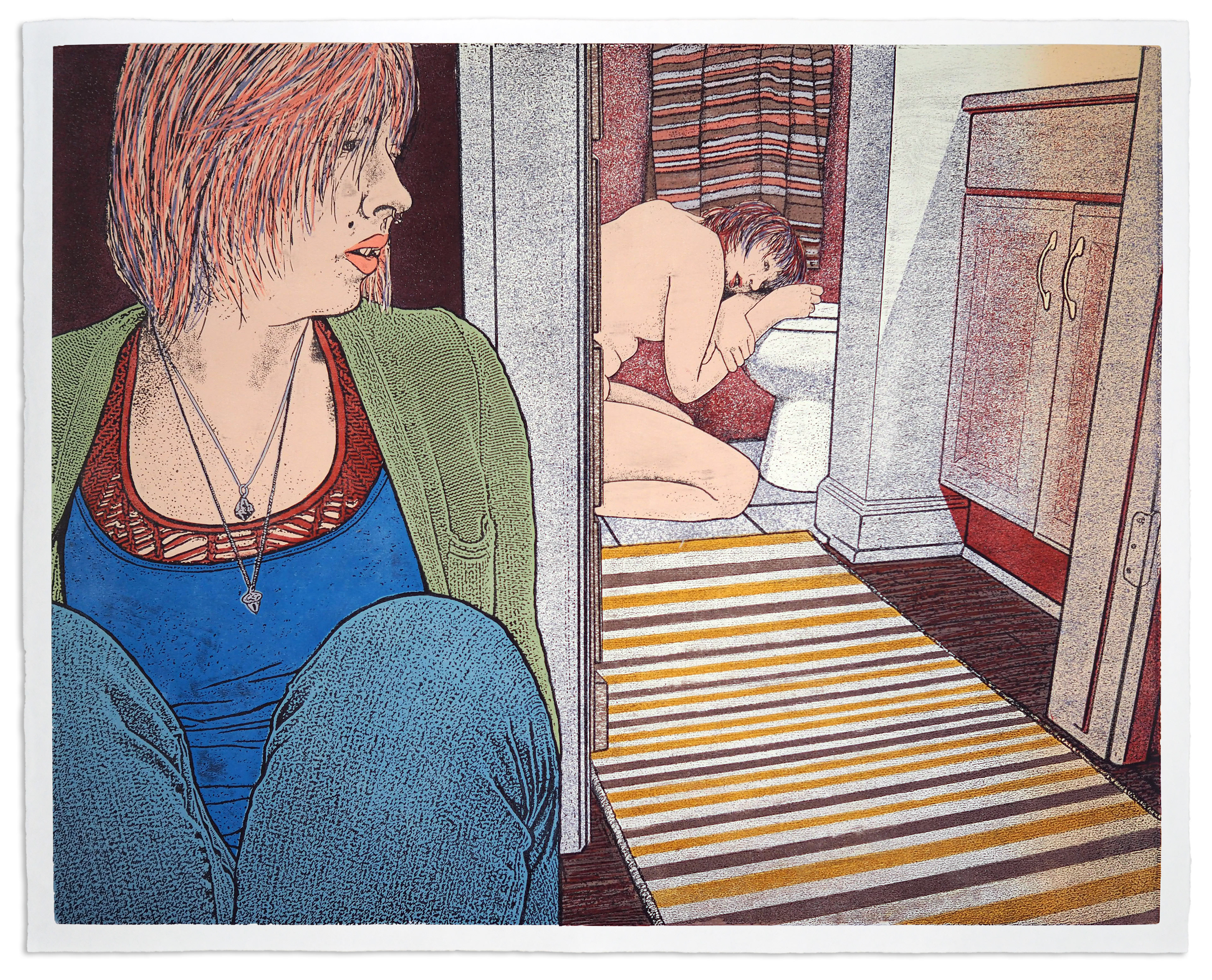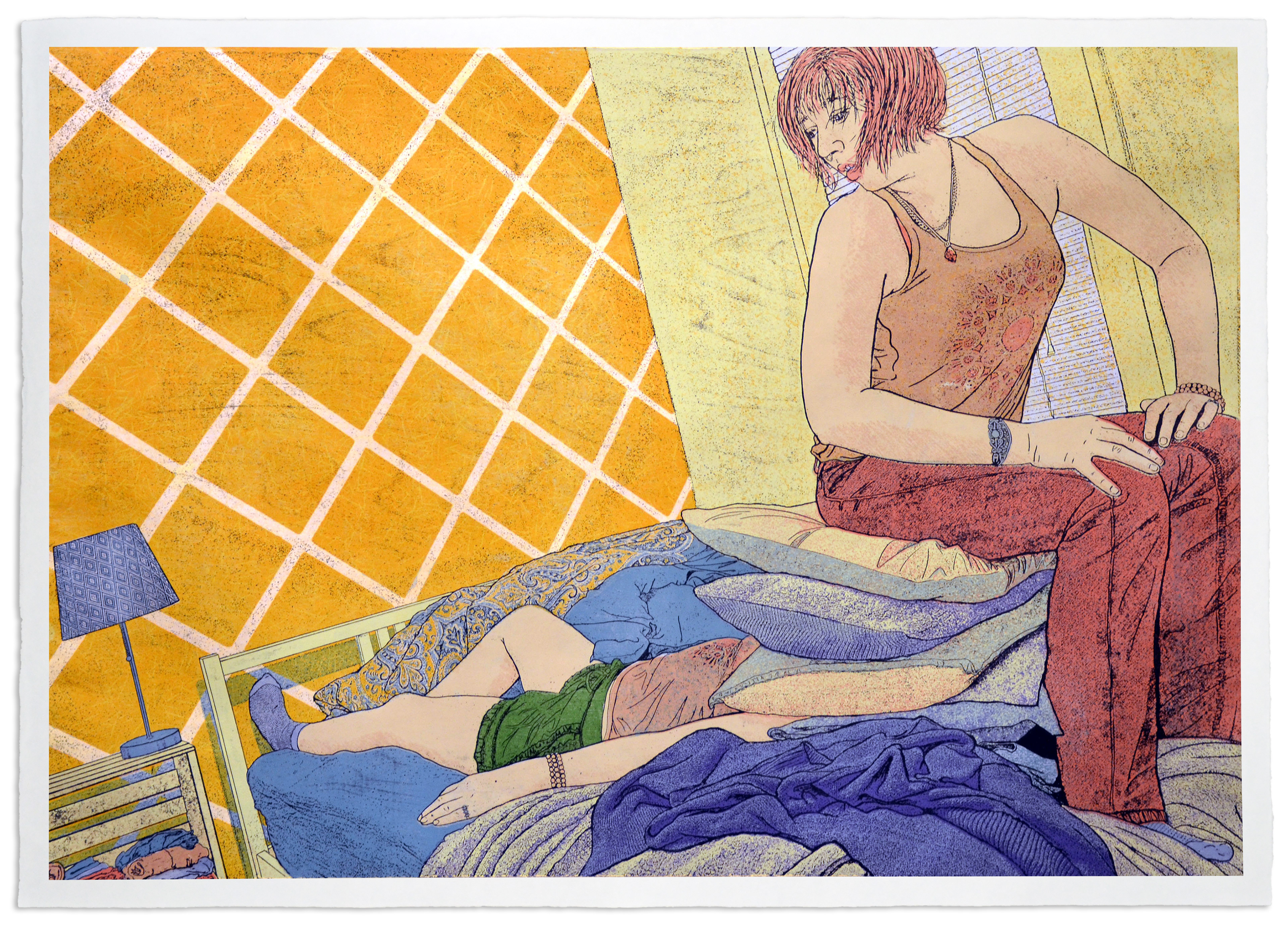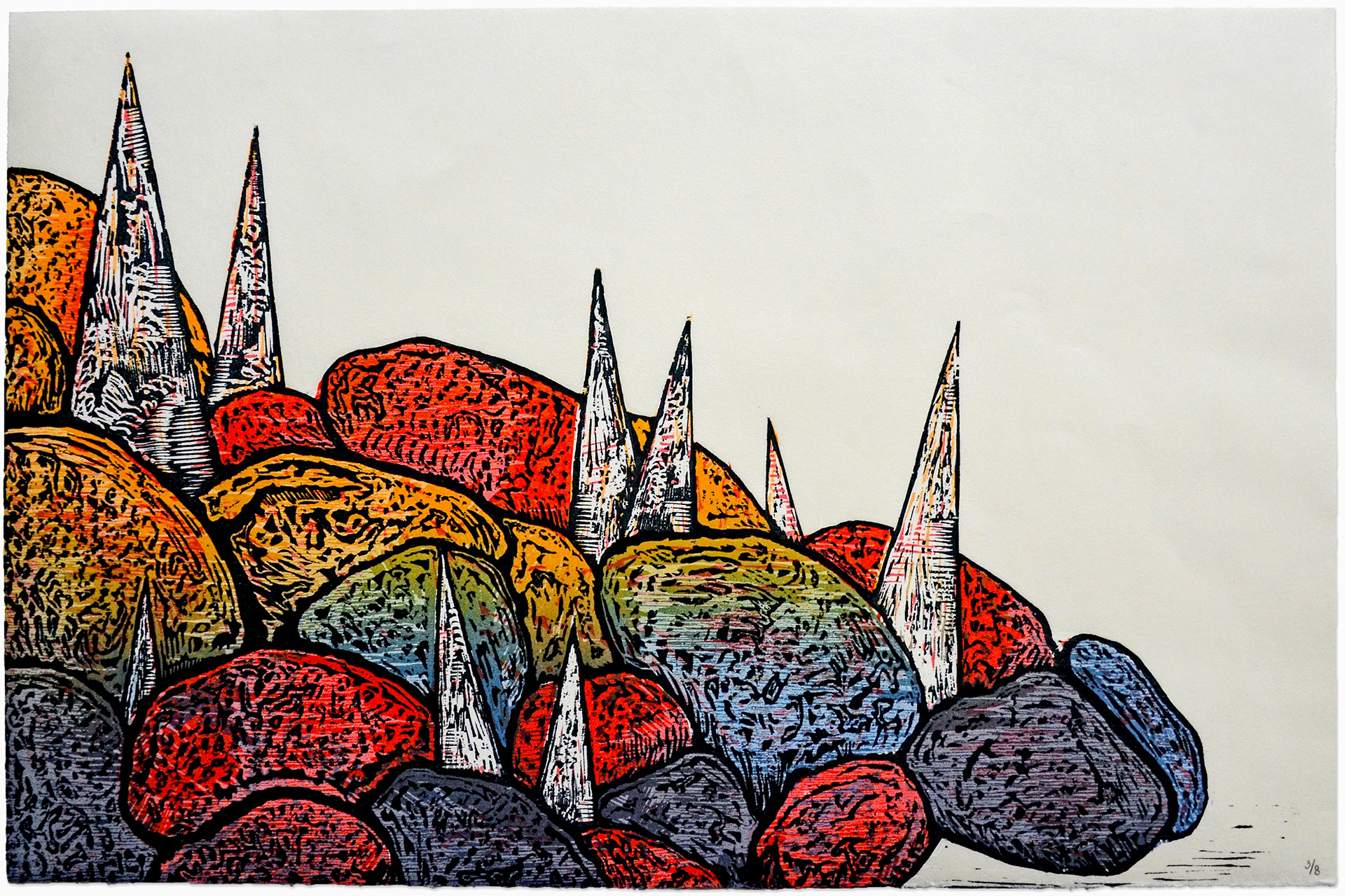 2 plate reduction linocut from 6 layers + key and 13 colors on Coventry Rag, 18x24in (46x61cm), 2022.