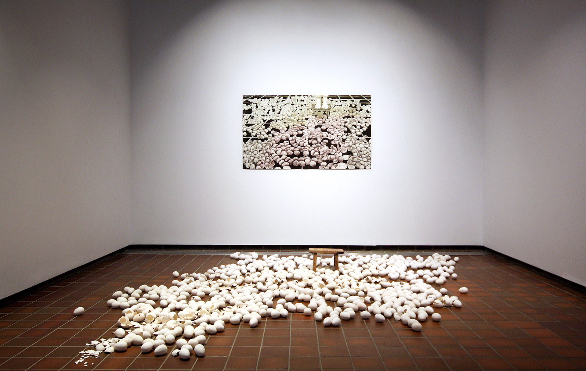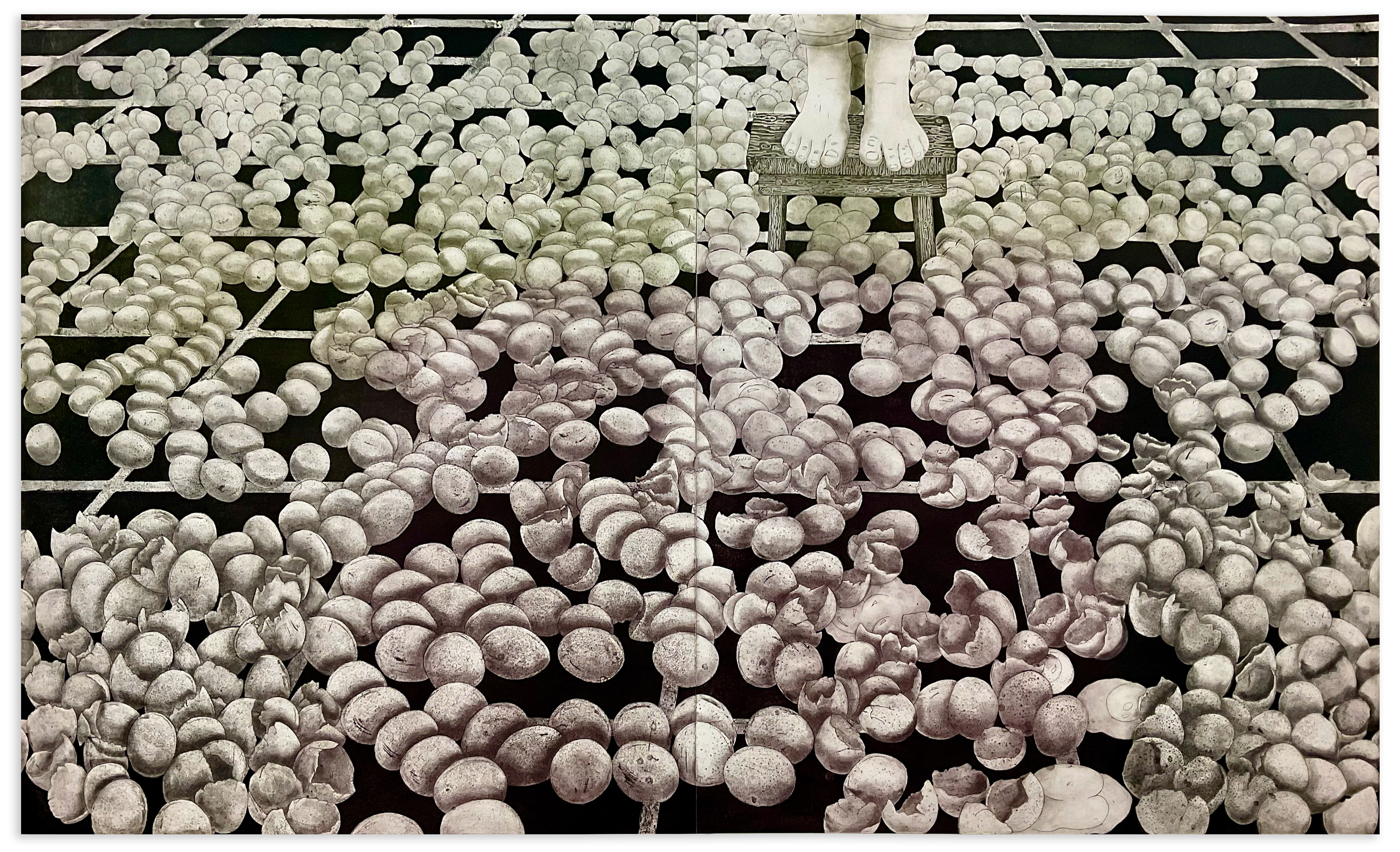 1000 slipcast earthenware eggs with 4 colors of underglaze. Approximately 12x12 sq ft. 2023.