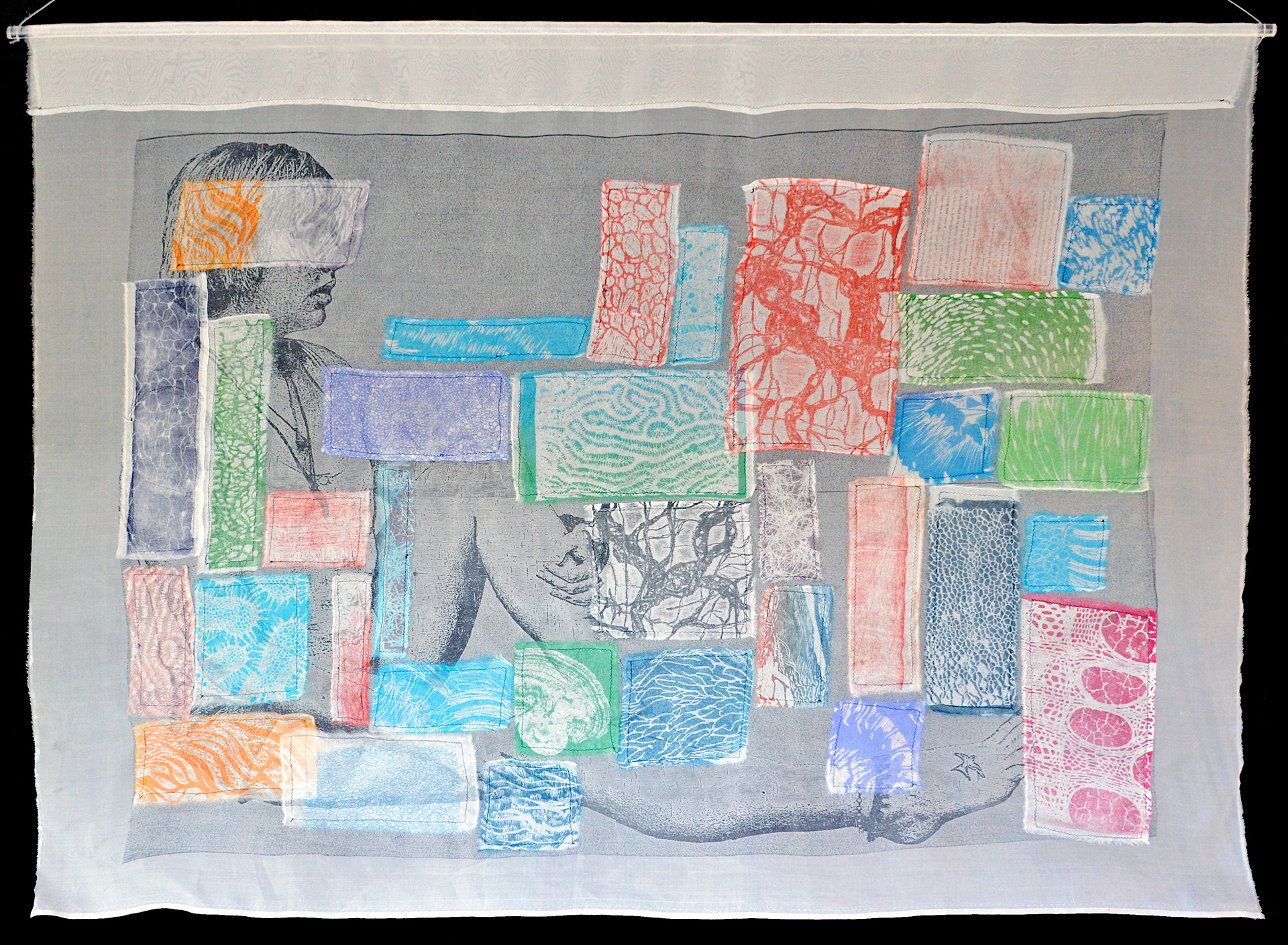 Oil-based relief woodcut on silk organza, appliqué quilt stitch with linen thread.