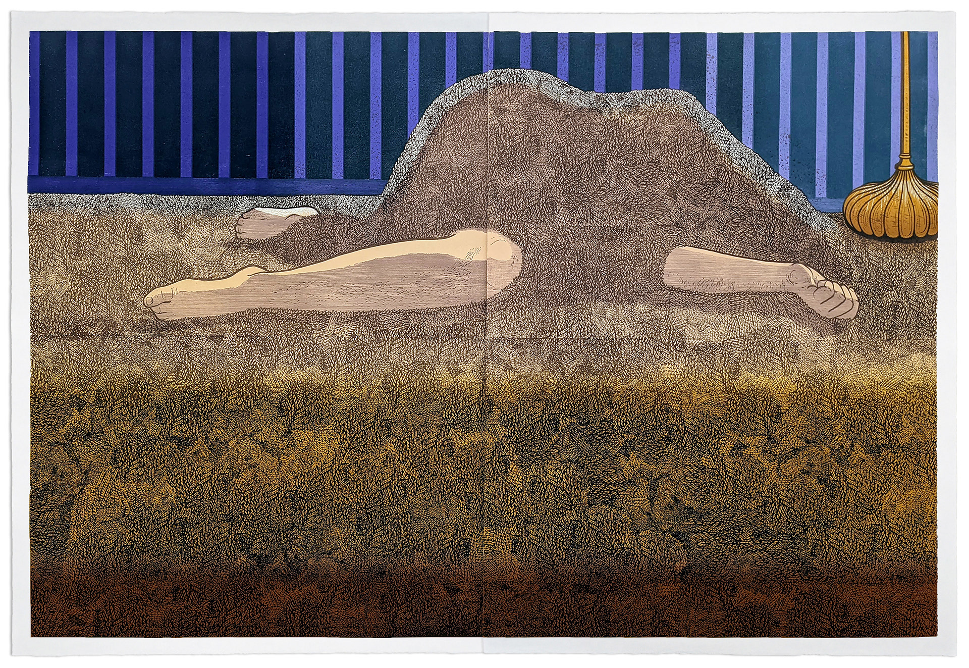 Woodcut on Thai Kozo from 3 plates & 10 colors. 48x72in (122x183cm). 2022.
