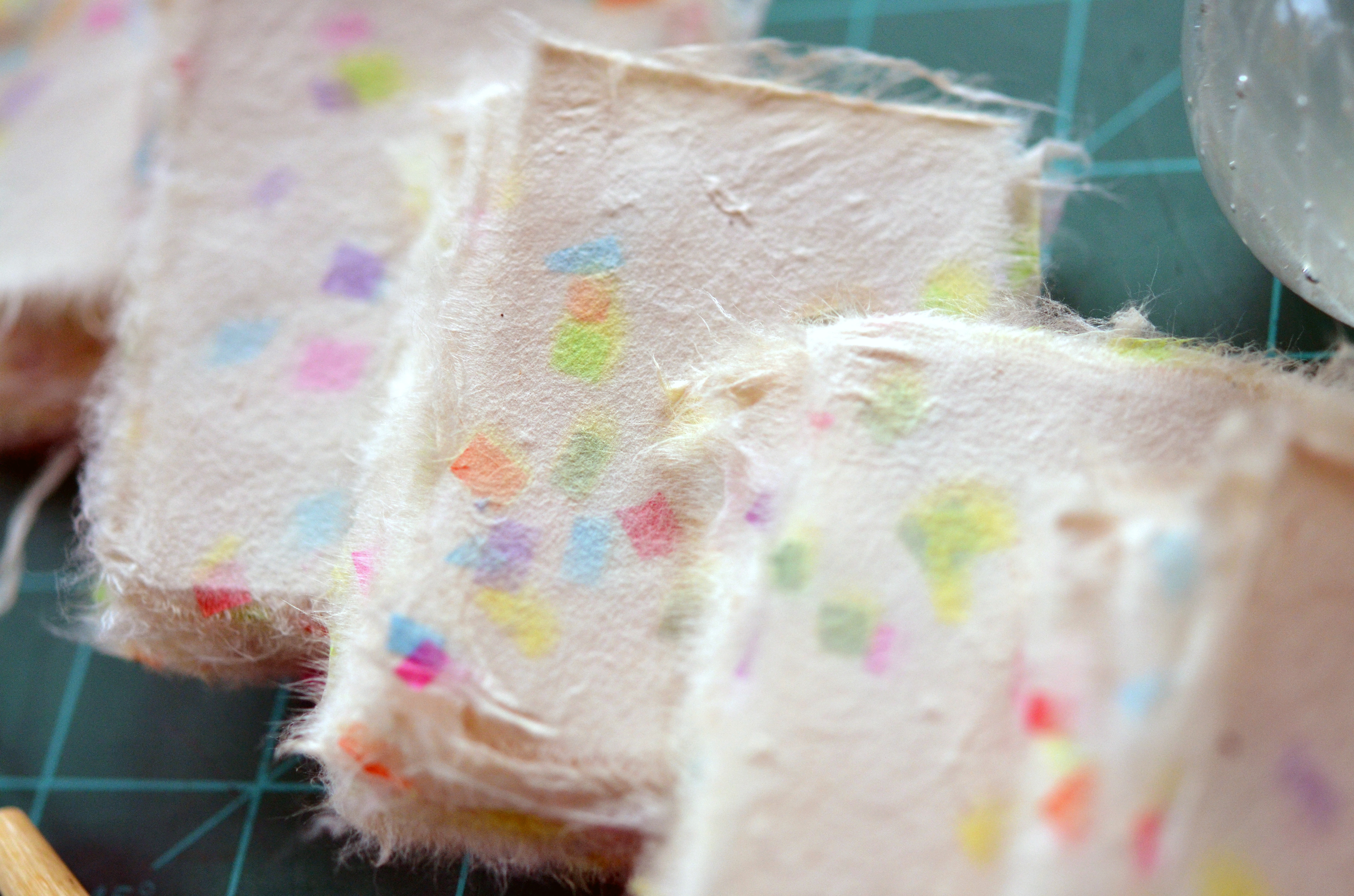 Funfetti Washi, 50/50 Tosa Kozo from the Obara region of Aichi Prefecture’s Toyota City, Japan and Japanese Mitsumata sourced from Carriage House Paper, Brooklyn, NY. Sprinkled with torn craft tissue paper. Fibers are beaten by hand with an oak mallet and Washi is formed on a traditional fine mesh Suketa.
